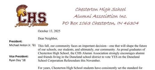 The CHS Alumni Association was formed in 2018 to help support the enhancement of the Duneland School Corporation’s educational processes and scholarships for graduating seniors at Chesterton High School.